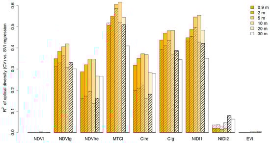 Across-scale optical diversity and productivity relationships (calculated for the 30 60 × 60 m ROIs) expressed as the R2 values of the linear regression between CV (calculated from continuum-removed reflectance) and spectral vegetation indices at increasing pixel sizes (0.9–30 m). Solid color bars indicate the R2 values when the CV was calculated from the AisaEAGLE full spectrum continuum-removed reflectance, while the striped-line bars indicate the R2 values when the CV was calculated only from the continuum-removed reflectance values of the Sentinel-2 simulated bands. The bars highlighted with a bold line are indicating the R2 values obtained with the full simulation (both spectral and spatial resolution) of Sentinel-2 data.