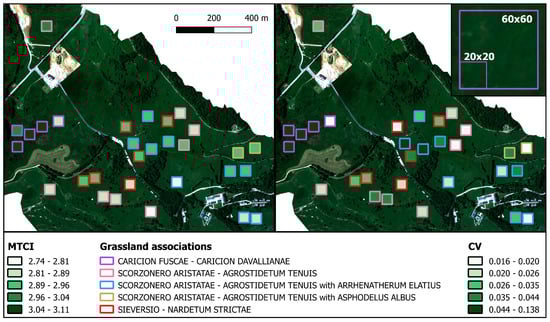Map of the productivity (expressed as MTCI, on the left) and optical diversity (expressed as CV, on the right) values for the 30 60 × 60 m ROIs located on the different grasslands associations. The spectral and spatial resolutions of the image used to process the map were achieved resampling the AisaEAGLE hyperspectral imagery and simulate the resolutions which can be obtained using Sentinel-2 data to calculate all the investigated SVIs. Darker green colors correspond to higher levels of productivity (expressed as MTCI, on the left) and optical diversity (expressed as CV, on the right).