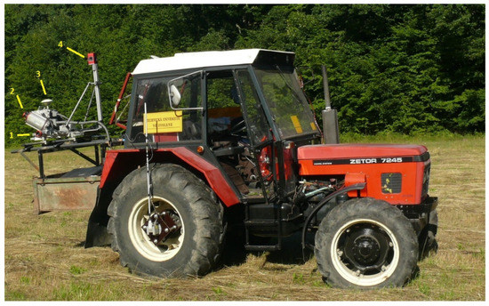 The MMS navigation system consisted of the Applanix GNSS-POS LV 510, IMU-31, odometer, and control unit. The Applanix GNSS-IMU navigation system, integrated on the RIEGL VMX-250, is only suitable for outages up to 1 min/1 km [33]. The MMS was mounted on tractor Zetor Horal 7245 (Zetor Tractors a. s., Brno, Czech Republic). Table 1 and Table 2 list further details and technical specifications of the MMS.