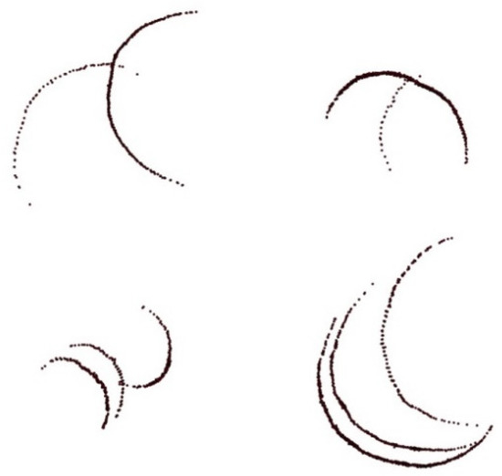 Intersecting point clusters reflected from four tree stems. The spatial relationship between these groups of point clusters was modified for a better demonstration of misalignment.