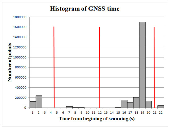 Principle of GNSS time based point clustering. Centers of histogram gaps, which were used for dividing the point cloud, are highlighted by red lines.