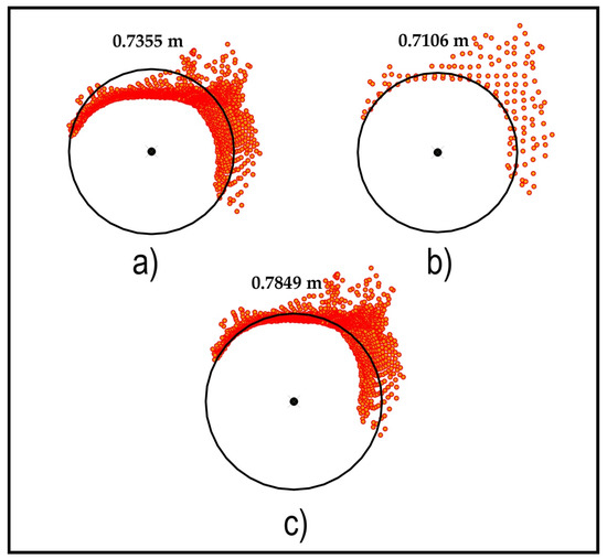 Estimation of point cluster diameter. Estimated diameters are shown above the point clusters. Circle estimated using maximal distance (a). Circle estimated using circle-fitting method and generalized geometry of point cluster (b). Optimization of the circle fit using all points of the cluster (c).