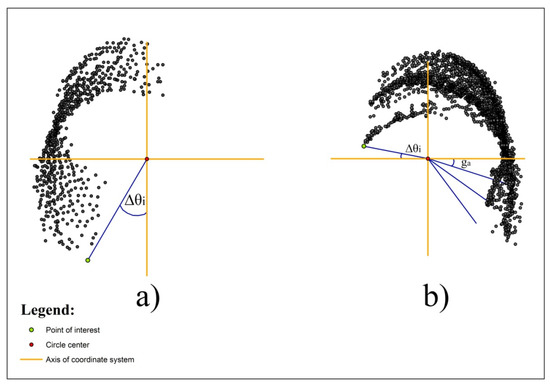 There are two different approaches to the angle range calculation. If any point in the cluster has a direction angle of 0 ± ga°, the histogram of direction angles is created. The histogram bin-width is ga°. The number of points for the bins in the histogram are checked, starting from the bin with direction angles ranging from 360° to 360 - ga°, until a bin with no points is found. The minimum value of the direction angle is taken as the start of the angle range from last bin containing any number of points. The maximum angle of all the points with angles lower than the starting value of the angle range is considered as the angle at the end of the angle range (Figure 6b). If no point in the cluster has a direction angle of 0 ± ga°, a simple calculation of the angle range is used. In this case, the minimum value of the direction angle is used as the start of the angle range, and the maximum value is used as the end of the angle range (Figure 6a). Finally, calculated angle ranges for compared point clusters are used to estimate the horizontal overlap of the point clusters intended for registration. If their overlap is higher than 55°, point clusters proceed to registration.