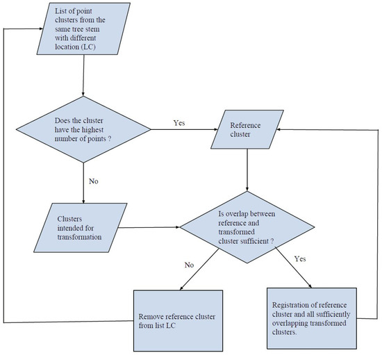 Point clusters aligned in the first execution of the module were merged into one file. The horizontal overlap of merged point clusters and remaining point clusters from the same stem was calculated. If any other point cluster exhibited sufficient overlapping with merged clusters, it was aligned to them. This verification was carried out until all sufficiently overlapping point clusters were aligned (Figure 8).