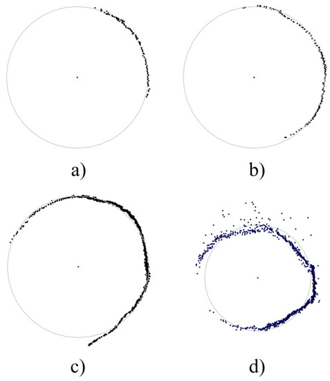 The third parameter, used for comparison of point clusters, was the difference between the estimated diameters of compared point clusters ∆dAB. The diameter was estimated using a simple circle-fitting method. The initial circle center was estimated by the midpoint of the line connecting two most distant points of the cluster (Figure 5a). Subsequently, the position of the circle center was shifted into four directions (+x, −x, +y, −y) by 5 mm steps, and for each new circle position, the radius ro that best fits the point cluster is found by minimizing the RMSE, calculated as