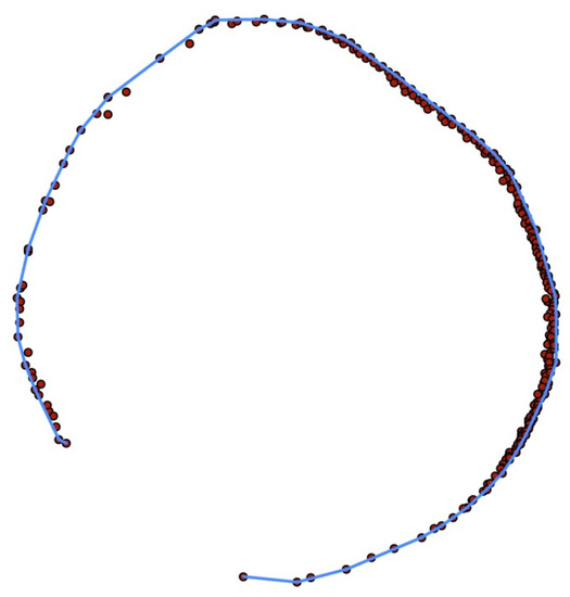 Generally, MLS coverage describes the feasibility of the point cloud for the tree modeling. In order to estimate the coverage, previously created segments of points from aligned point clusters and estimated diameters in the form of point features were imported into ArcGIS 10.2. For each point cluster, the convex hull was constructed using the minimum bounding geometry tool. The convex hull was converted into a polyline feature. The polyline was edited so that only the part that is covered by points from the tree stem remained (Figure 10). Finally, the length of the edited polyline li was calculated.