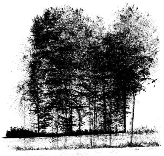 One of the flaws of the introduced processing chain is semi-automatic tree detection. While the tree stem can be detected using the group by distance method [28], some non-tree objects can be also classified as a tree and have to be manually removed from the point cloud. Furthermore, the point clouds from tree stems detected by group by distance method can contain some point noise, which was also filtered manually in this study. The manual filtration was done due to relatively low occurrence of noise, but can be substituted by point-density-based filtering methods contained in presented software [29,30,31,34]. More efficient detection of tree stems can be also achieved by using cylinder-fitting methods such as that of Liang et al. [38]. Proposed processing chain also utilizes multiple software products. The used software products are originally developed for processing of ALS data with lower point density. Although the OPALS software offer the tools for ground points classification, in order to obtain set of ground with resolution and accuracy similar to the presented processing chain, combination of multiple tools is required.
