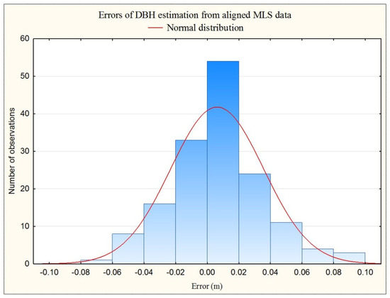Histogram of errors in DBH estimation from the aligned MLS point cloud.