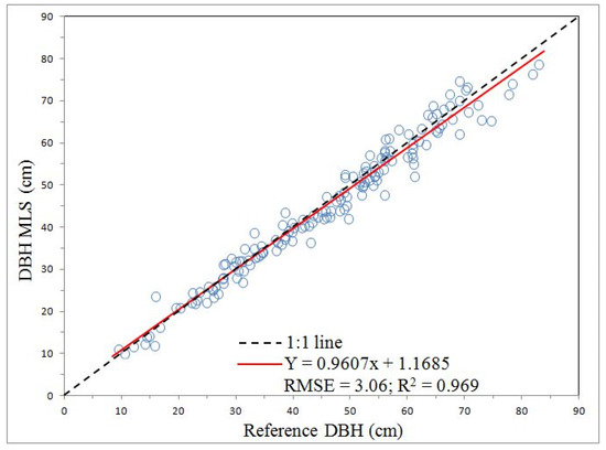 Scatterplot of DBH estimations from MLS and reference DBH measured by caliper.