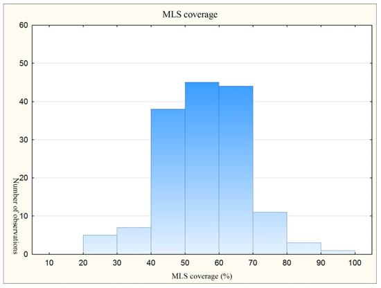 The completeness of the tree stem cross-section was evaluated using the MLS coverage parameter. In this study, the convex hull was constructed for every detected tree stem. MLS coverage of the tree stem was calculated using the circumference estimated by the Monte Carlo method and the part of the convex hull covered with points (Figure 15). MLS coverage of the tree stems ranged from 24.98% to 94% with a mean of 55.95% (Figure 16).