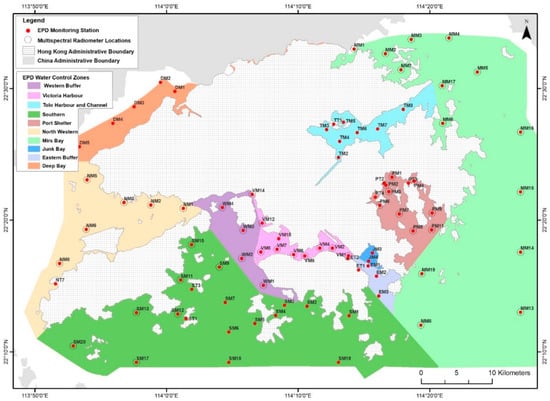 Hong Kong is a subtropical city located on the Pearl River Estuary’s eastern coast with 1106 km2 of land and 1649 km2 of marine areas (Figure 1). Development of industries, accompanying the urbanization of the adjacent Guangdong province of China, has resulted in adverse environmental degradation in water quality along the coastlines []. Due to the combination of anthropogenic activities and variable geophysical environment, the coastal waters of Hong Kong are physically and chemically complex. For example, water quality in the western areas of Hong Kong (e.g., Deep Bay and Northwestern zone) are influenced by the turbidity of the Pearl River discharges and the high loads of microalgae, usually associated with high nutrients (Figure 2). Conversely, the eastern areas (e.g., Tolo Harbor and Mirs Bay) are mostly influenced by the Pacific currents, and the central areas are influenced by both the Pacific currents, and industrial/residential effluents from Hong Kong and the Pearl River []. In addition, SS and turbidity along the coasts of Hong Kong vary spatiotemporally with the river discharge, winds, and tidal fluctuations. In late summer to early autumn the eastern and southern waters are affected by frequent algal blooms, due to both natural and anthropogenic causes []. Due to the high variability in this complex coastal environment, using an empirical model such as linear or multivariate regression may not be promising for predicting WQIs across these coastal waters.