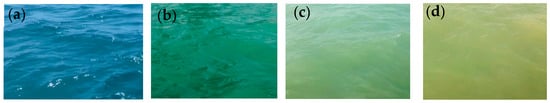 Water color in different parts of Hong Kong: (a) clear water near MM19, (b) water with high Chl-a near NM1, (c) turbid water near NM6, and (d) highly turbid water near the NM5 station of EPD (shown in Figure 1).