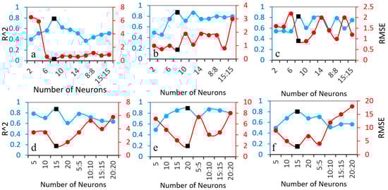 Different model designs with cross-validation R2 and Root Mean Squared Error (RMSE). First row shows different models for Chl-a (a), SS (b), and turbidity (c) when in-situ SR data was considered; and second row shows different models for Chl-a (d), SS (e), and turbidity (f) when satellite SR data was considered. The symbol “:” on the x-axis indicates the model with two hidden layers, while the number shows the number of neurons in each layer.