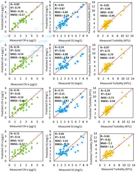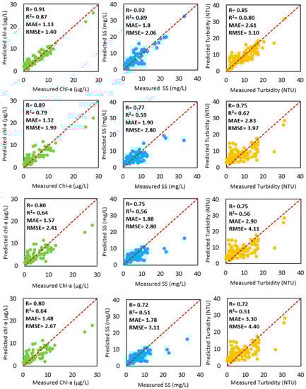 Comparison of measured and predicted values of Chl-a, SS, and turbidity when in situ MSR-16 reflectance data were used: (Row 1) WQI estimation by ANN, (Row 2) WQI estimation by SVR, (Row 3) estimation by Cubist, and (Row 4) WQI estimation by RF.