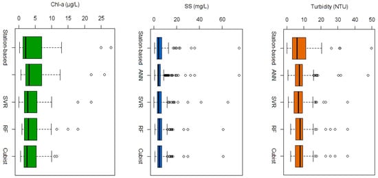 For Chl-a concentration, there are high correlations for all models, in which ANN has the best performance with an R of 0.89, MAE of 0.20 μg/L, and RMSE of 0.27 μg/L, followed by SVR with an R of 0.76, MAE of 0.54 μg/L, and RMSE of 0.66 μg/L. The lowest performance was observed for the RF with an R of 0.71, MAE and RMSE of 0.57 μg/L, and 0.72 μg/L, respectively. CB showed slightly better results than RF with a R of 0.76, MAE with 0.54 μg/L, and RMSE with 0.66 μg/L (Figure 4). Similar findings were obtained when four machine learning regressions were applied to estimate SS concentration and turbidity. The ANN showed the best results with an R of 0.93 for SS prediction and an R of 0.82 for turbidity prediction; with the lowest values of MAE and RMSE of 0.68 mg/L and 0.70 mg/L for SS prediction, respectively, and 0.82 NTU and 0.94 NTU for turbidity prediction. The Cubist and RF model underperformed compared to the multivariate regression model (Table 6). Forward selection performed the best in case of Chl-a, and backward and bidirectional selection model perform superior in case of SS concentration estimation