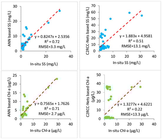 Scatter plots of in situ and estimated SS by ANN and C2RCC-Nets (Row-1) and scatter plots of in situ and estimated Chl-a by ANN and C2RCC-Nets (Row-2).