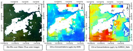 Based on the accuracy of the model comparison, ANN was demonstrated to be the best model for predicting WQIs in this subtropical area. Therefore, ANN was further applied to the satellite images for mapping the spatial concentration of WQIs across the coastal waters of Hong Kong. Station-based values of WQIs measured within a one day gap were considered to validate the predicted WQI concentration, as the EPD station data within a one day gap were available considering the cloud-free and glint-free conditions of satellite data. The Chl-a and SS data estimated by the ANN model were also compared with Chl-a and suspended particulate matter (SPM) concentration retrieved by the C2RCC-Nets model (Figure 7). The ANN model developed in this study has underestimated the high values of WQI with RMSE 3.5 mg/L for SS (22–31 mg/L) and RMSE 5.0 µg/L for Chl-a concentration (22–30 µg/L), the reason for this could be due to less data records against the high values of WQI used during training of model. C2RCC-Nets overestimated the WQIs and the RMSE is high, especially for SS and Chl-a > 20. The RMSE for SS is 31.1 mg/L and for Chl-a 11.1 µg/L. This trend is also visible during algal bloom event occurred in the Deep Bay on 2nd Jan 2017 and southwestern waters on 4th Jan 2017 due to phytoplankton specie Phaeocystis globose []. Both events prolonged to nearly three weeks and captured in OLI image dated 8th Jan 2017 (Figure 8).
