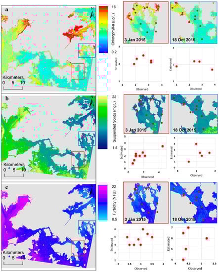 Figure 9 shows the synoptic view of three WQIs and graphs of observed and estimated values of WQIs using ANN model. MAE in case of Chl-a was 0.88 µg/L (data range 0.9–3.8 µg/L), MAE for SS was 0.89 mg/L (data range 0.6–4.5 mg/L), and MAE was 1.72 NTU (data range 2–7 NTU) in the case of turbidity.