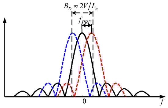 If the PRF is excessively low, the part of Doppler frequency higher than PRF is folded into the azimuth spectrum, resulting in the occurrence of azimuth ambiguity. Figure 1 illustrates azimuth ambiguity formation with azimuth antenna pattern and PRF.  is the Doppler bandwidth and , where  is the SAR platform velocity and  is the antenna size in the azimuth direction. When  is greater than the value of PRF, as shown in Figure 1, undersampling causes aliasing in the azimuth spectrum. Blue and red dashed curves denote the first left and right replicas due to the sampling, respectively.
