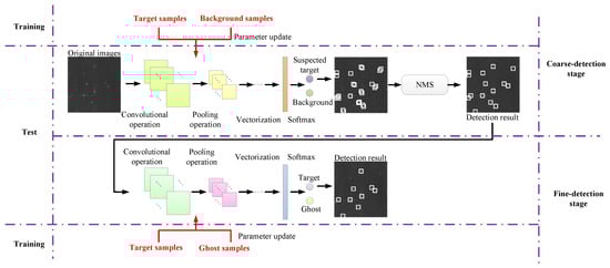 During the coarse-detection stage, the network was trained using target and background samples. This part of the network mainly focuses on ROI extraction from a large imaged scene. Since unwanted ghost replicas are major interference sources that remain in ROIs, coarse-detection stage outputs are inputs into the fine-detection stage network, which facilitates the discrimination between real targets and ghosts. In the meantime, the fine-detection stage network is trained using target and ghost samples. NMS is disposed to all ROIs, which are extracted during the coarse-detection stage. Based on this process, ship target detection in spaceborne SAR imagery can be realized.