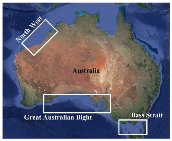 Location illustration: North West, Great Australian Bight, and Bass Strait of Australia, where Sentinel-1 SAR images are collected for the experiments.