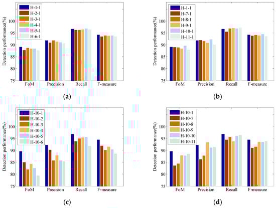 Figure 9a illustrates detection results of H-1-1, H-2-1, H-3-1, H-4-1, H-5-1, and H-6-1. According to Table 2a, we identified differences in kernel numbers in stage1, while other parameters were similar. Hence, we could confirm kernel numbers during the coarse-detection stage by applying this comparison. Results in terms of FoM, precision, and F-measure showed that the optimal situation is H-1-1. As to the assessment in recall, H-1-1 is the second best one, but very close to H-5-1, which has the highest value in Figure 9a. It illustrates that compared to 4, 6, 8, 9, and 12, 3 is the best kernel number choice during coarse-detection stage. Therefore, the kernel number during coarse-detection stage was set to be 3 for the following comparison experiments.