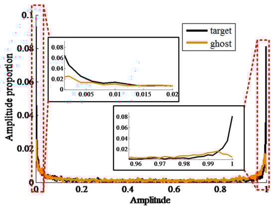 In this part, we investigated the feature extraction quality of target chips and ghost replicas. If features are significantly different, the degree of distinction between two chips improves. The chips introduced in Section 3 were disposed by H-CNN and we collected their feature maps. The amplitude distribution was obtained by the same method. Distributions are shown in Figure 11. Amplitude for most focus points on the two regions, 0–0.02 and 0.96–1, are enlarged. The two distributions are dissimilar, especially in these two enlarged parts. Compared to Figure 4, distribution differences are obvious in Figure 11. It indicates that the distinguishable degree of features extracted by H-CNN is stronger than that of the original chips.