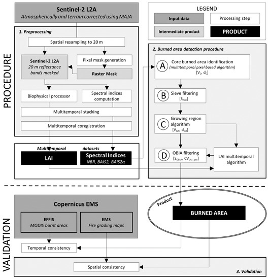 The processing chain (Figure 1) designed to analyze the S2 data is composed of three main phases: (1) preprocessing; (2) burned area detection procedure; (3) validation.