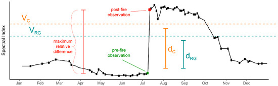 Single pixel multitemporal profile showing the fire spectral index and the burned area identification parameters. Spectral-temporal rules are implemented to find the maximum relative difference. Parameters are used to detect core burned areas (thresholds on spectral index value VC and spectral index maximum increment dC) and to control region-growing using a set of more relaxed rules (thresholds on spectral index value VRG and on difference spectral index value dRG).