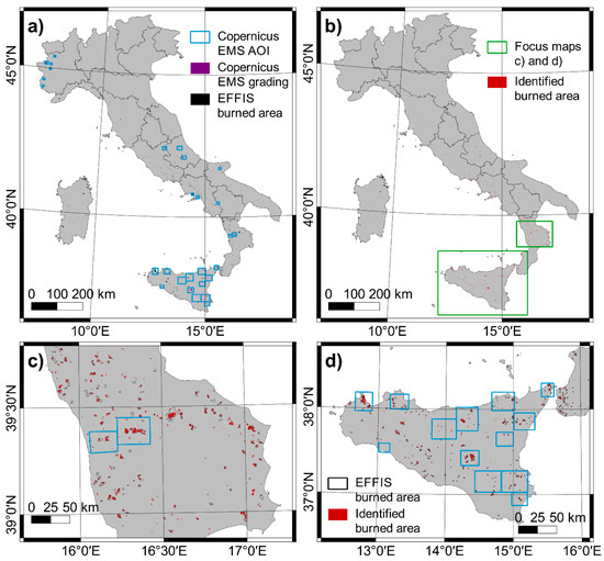 (a) Spatial distribution of the EFFIS “MODIS burned areas” reference products and Copernicus EMS rapid mapping activations (areas of interest are overlaid); (b) spatial distribution of the identified burned areas; (c) focus map of the identified burned areas over the Calabria region; (d) focus map of the identified burned areas over the Sicily region.