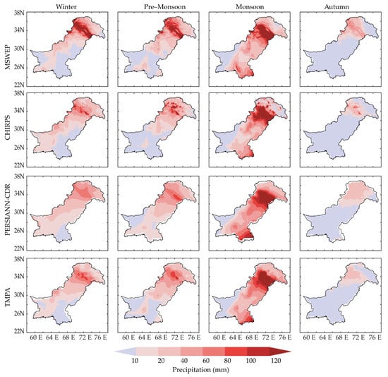 Two precipitation patterns are observed in Pakistan, the first is due to disturbances of westerlies in the winter and pre—monsoon season and the South Asian monsoon, which is the primary driver of the hydrological cycle in the region [37,48]. The GPPs clearly showed these two precipitation patterns, with a slight deviation from the mean; however, during the winter and autumn seasons, MSWEP and CHIRPS captured higher precipitation values in the northwest which could be associated with relatively higher grid size resolution of these two GPPs.