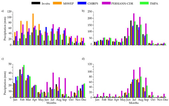 Figure 3a–d shows the mean annual precipitation cycle for the four selected regions as shown in Table 1. From Figure 3a it can be seen that precipitation maxima occurred in April (≥50 mm) and the minima occurred in October (<20 mm). With in-situ as reference, all GPPs were able to show the seasonality but overestimated the [monthly average] precipitation (Figure 3a). MSWEP, PERSIANN-CDR and CHIRPS captured larger values than in-situ throughout the seasonal cycle; however, TMPA performed relatively well.
