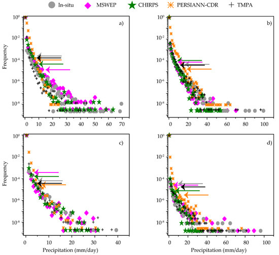 For a daily scale comparison, frequency versus intensity histograms were plotted in Figure 4 for the precipitation in each region. In-situ stations (traditional rain gauges) might not capture precipitation events with magnitudes of less than 0.25 mm/day very well, which is generally treated as traces, thus precipitating days considered were ≥0.25 mm per day [49]. Figure 4a–d shows the frequency and relative intensity of in-situ and GPPs at each region, while the arrows indicate 95th percentiles. Figure 4a indicates that in-situ data had a lower frequency of days with relatively low precipitation amounts than the GPPs. Both in-situ and GPPs had a similar frequency of precipitation events of <25 mm and excluding MSWEP, rest of the GPPs showed good agreement at the 95th percentile moreover PERSIANN-CDR does not identify days with precipitation amount > 25 mm/day. Figure 4b shows that both in-situ and the GPPs had an alike frequency and intensity for events with precipitation of <45 mm, although relatively lower magnitude events had a higher frequency in CHIRPS and PERSIANN-CDR than in TMPA and MSWEP.
