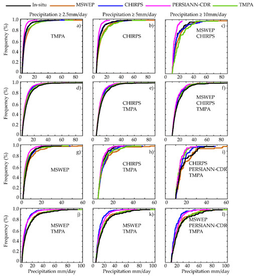 In Figure 5d–f, we see that in region 2 GPPs underestimated precipitation events of ≥2.5 mm/day. For precipitation events of ≥5 mm/day, all GPPs consistently underestimated in-situ precipitation, while CHIRPS and TMPA had a significant resemblance to in-situ precipitation. For precipitation events of ≥10 mm/day, MSWEP, CHIRPS and TMPA had a significant similarity to the in-situ. In region 3, Figure 5g–i, MSWEP produced a significant ECDF for precipitation events of ≥2.5 mm/day, however, precipitation was overestimated. For precipitation events of ≥5 mm/day CHIRPS and TMPA had a significant similarity to in-situ data. PERSIANN-CDR underestimated in-situ precipitation. The performance of gridded data improved when capturing precipitation events of ≥10 mm/day, for which the ECDFs of CHIRPS, PERSIANN-CDR and TMPA were significant, although they underestimated the in-situ precipitation at daily scale.
