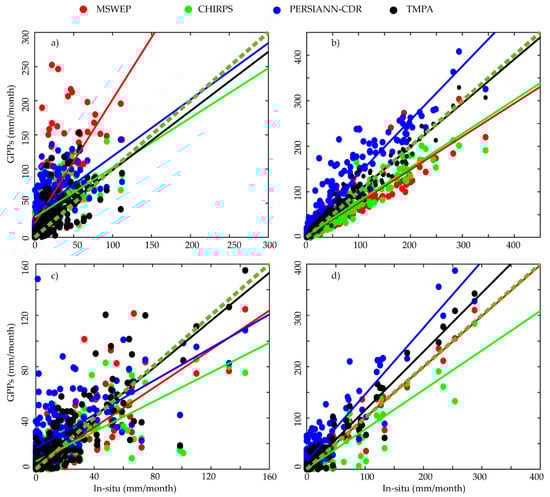 Scatterplots of monthly precipitation for in-situ and GPPs at selected locations. (a–d) are equivalent to regions 1, 2, 3 and 4 in Table 1.
