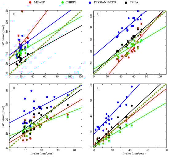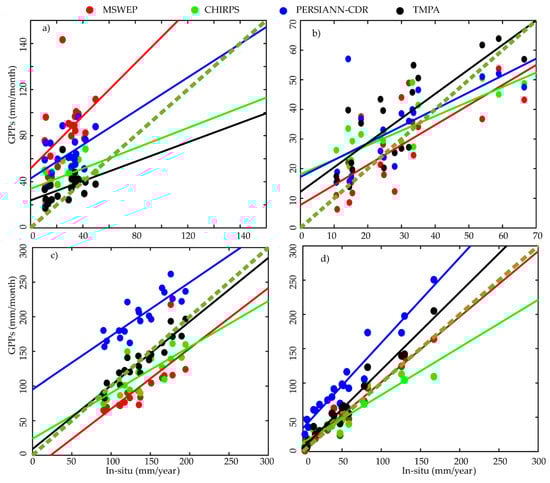 Scatterplots of annual mean precipitation for in-situ and GPPs at selected locations. (a–d) are equivalent to regions 1, 2, 3 and 4 in Table 1.