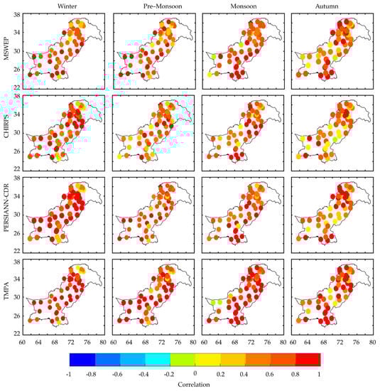 During the pre—monsoon season, MSWEP performance in depicting precipitation was similar to its winter performance, with low R values in the north (≤0.60) and high values in central (≥0.60) and southern (≤0.80) regions. CHIRPS and PERSIANN-CDR were less effective at capturing precipitation variability. For TMPA there were also low R values in the north, while in the central and southern regions R values were observed to be ≥0.80 for most stations.