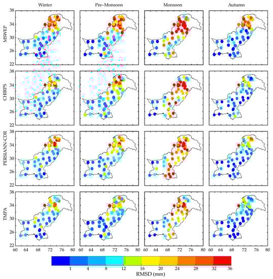 From Figure 9 it can be seen that the RMSD was higher during peak precipitation seasons, as indicated in the winter, pre—monsoon season and especially the monsoon season. Stations located in different climate regions and at different elevations reported dissimilar results. The higher RMSD values in the north and lower values in central and southwestern regions could be possibly due to differences in land cover, precipitation magnitude, station geography towards precipitation bearing winds and altitude that influence the rain rates [35,37].