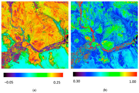 Red band (a) R and (b) V parameters applying inverting Equation (6) over an HLS image (tile 11SQS) on June 20th of 2017 in Yuma, Arizona (US).
