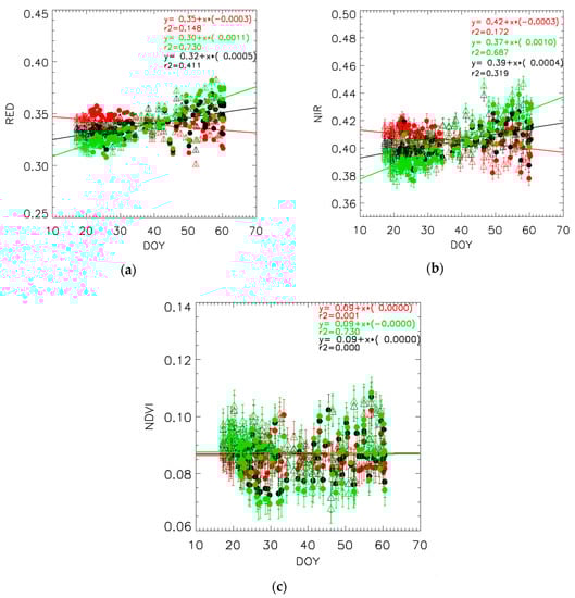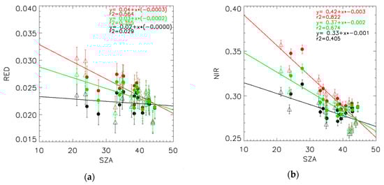 Arizona desert pixel Landsat 8 (dots) and Sentinel 2 (triangles) surface reflectance in the (a) RED, (b) NIR, and (c) NDVI with no normalization (red), HLS BRDF normalization (green), and the proposed BRDF-normalization (black) from 2013 to 2017 versus the SZA. The error bars displayed represent the uncertainty of the Landsat 8 surface reflectance product [], assuming the same error for Sentinel 2.