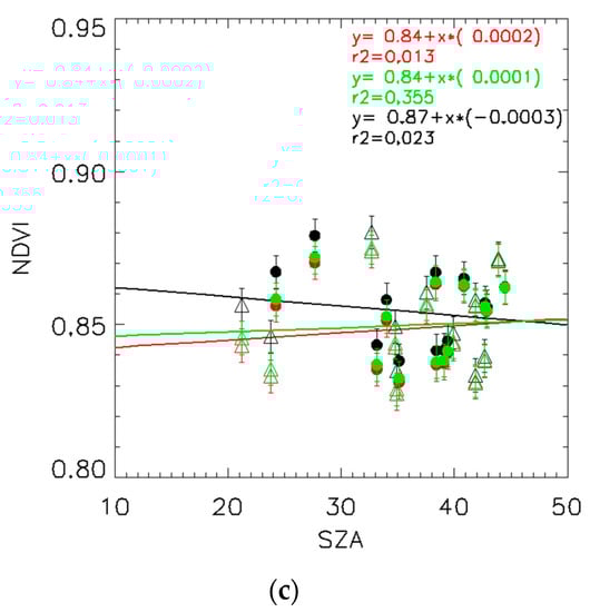 Peruvian Amazon pixel Landsat 8 (dots) and Sentinel 2 (triangles) surface reflectance in the (a) RED, (b) Near infrared (NIR) and (c) Normalized Difference Vegetation Index (NDVI), with no normalization (red color), HLS BRDF normalization (green color) and the proposed BRDF-normalization (black color) from 2013 to 2017 versus the Solar Zenith Angle (SZA). The error bars displayed represent the uncertainty of the Landsat 8 surface reflectance product [], assuming the same error for Sentinel 2. Adapted from Franch [].