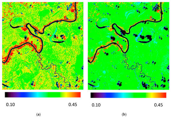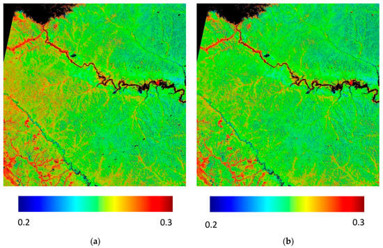 All parameters show good consistency for both satellites’ products. The directional surface reflectance (red) shows a clear dependency with the SZA in the RED (r2 = 0.56) but mostly in the NIR band (r2 = 0.82), showing higher values for low solar angles and lower values for higher angles. This effect is not fully corrected with the current BRDF-normalization of the HLS product (green), which after the correction still shows a dependency on the SZA in both bands. However, it is corrected on the BRDF-normalized RED reflectance and minimized in the NIR reflectance by decreasing the correlation coefficient and providing a slope closer to zero when using the proposed algorithm (black), which normalize all observations to SZA = 45° and nadir observation. The NDVI barely shows any dependency on the SZA for any product. Figure 4 shows a subset of the NIR band directional (left) and BRDF-normalized using the proposed algorithm (right) surface reflectance of the HLS image that is mostly affected by the SZA effect according to Figure 3. The directional reflectance image shows higher values than the BRDF-normalized one over the scene.