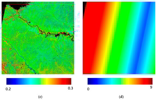 HLS NIR surface reflectance: (a) directional, (b) using the current BRDF normalization and (c) using the proposed normalization. (d) The view zenith angle of each pixel. Image on August 21th of 2016 in the Brazilian Amazon area.