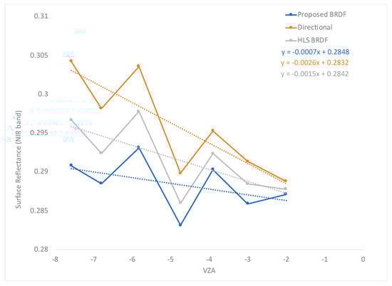 Figure 7 shows the transect surface reflectance versus the view zenith angle. Though there is variability through the different samples, we have added a trendline to show the angular dependency of each dataset. The directional reflectance shows the highest values and the largest slope with a p-value of 0.02, and it is followed by the current HLS BRDF normalization with a p-value of 0.08. The proposed method shows the lowest and more stable values with a slope closer to zero and a p-value of 0.31, meaning that there is no significant relationship between the corrected reflectance and the VZA. Additionally, the similar intercepts of the linear regressions show that the three datasets converge to a similar value at zero degrees observation. The analysis of the red band and NDVI (Appendix A) show similar conclusions but the directional effect is lower.