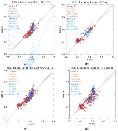 We also evaluate the BRDF normalization by using the BRDF parameters to derive the surface albedo, which can be validated with field measurements. Figure 8 shows the validation of the surface albedo over (a) the SURFRAD network, (b) the OzFlux network, and (c) both networks. Each marker in the plot represents an individual Landsat 8 or Sentinel 2 overpass. OzFlux validation shows lower errors (0.015–0.016) than SURFRAD (0.020). Sentinel 2 albedo validation in SURFRAD shows an overestimation for albedos higher than 0.2. However, this is observed in a total of 5 dates in Desert Rock and may be caused by an inaccurate atmospheric correction during those dates. Nevertheless, the overestimation is included within the RMSE of the sites. Combining both networks, the surface albedo validation shows a RMSE of 0.019 for Landsat 8 and 0.018 for Sentinel 2. Figure 8d shows the result of applying the narrow to broadband equation to the directional reflectance. In this case, the errors increase to 0.028 for Landsat 8 and 0.030 for Sentinel 2. Note that an equivalent evaluation cannot be included for the current HLS BRDF normalization method because in Roy [] it is explicitly stated that “this approach is not applicable for generation of Landsat surface albedo, which requires a full characterization of the surface BRDF”.