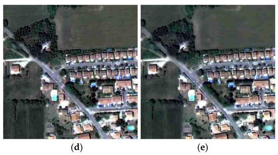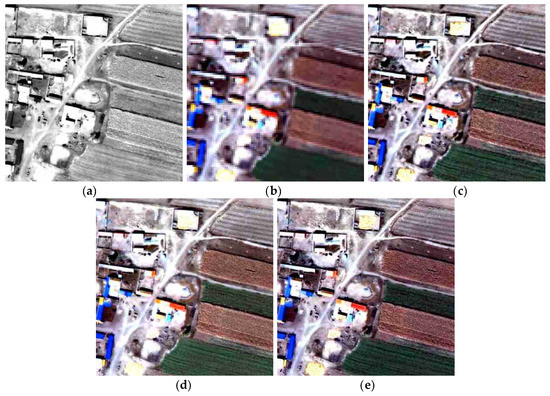 The details of pansharpened images according to each algorithm in the Salon region, France: (a) panchromatic image; (b) resized multispectral image; (c) image pansharpened by the generalized Laplacian pyramids with modulation transfer function-matched filtering (MTF-GLP) method; (d) image pansharpened by the Gram–Schmidt adaptive (GSA) method; (e) image pansharpened by the GF-based pansharpening algorithm using local injection gains based on the normalized difference vegetation index (GFNDVI) method.