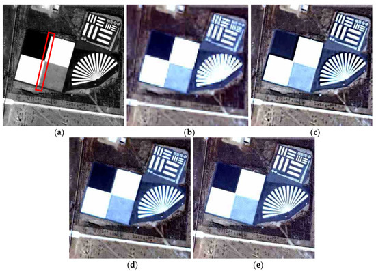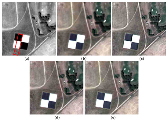 Additionally, to quantitatively analyze the spatial clarity of the pansharpened images, we analyzed the spatial characteristics of edge targets existing within the image. The results of enlarging the edge target area existing in the pansharpened image are shown in Figure 6 and Figure 7; evidently, the pansharpened images generated by the existing techniques do not show an edge target with definite linearity. In particular, the MTF-GLP, which is an MRA-based pansharpening algorithm, greatly distorts the edge characteristics of the target. Aliasing and blurring are observed in the edges around the target, even in the case of the images fused by the GSA. However, the pansharpened image generated by the GFNDVI effectively represents the edge information of the target, as shown in Figure 6e and Figure 7e. In particular, as shown in the specific area of the red rectangle in Figure 6a and Figure 7a, the edge lines between the black and white areas in the pansharpened images generated by the MTF-GLP and GSA include the effects of aliasing and artifacts. However, the edge target in the pansharpened image produced by the proposed algorithm does not exhibit artifacts. Figure 8 presents magnified views of the area encompassed by the red rectangle in Figure 7a. As shown in Figure 8b,c, the images pansharpened by the MTF-GLP and GSA exhibit aliasing around the edges between the black and white areas of the edge target. Furthermore, the image pansharpened by the MTF-GLP displays spectral distortion around the cross line of the edge target, as shown in Figure 8b. However, the image pansharpened by the proposed algorithm has similar spatial characteristics to those of the original panchromatic image, as shown in Figure 8a,d. Therefore, our proposed algorithm preserves the spatial information of the original panchromatic image during the pansharpening process, while minimizing spectral distortion.