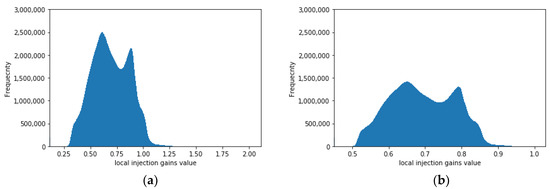 Histogram plot of local injection gains according to blue band of the Salon region of France: (a) result by Equation (9) [5]; (b) result by the proposed algorithm (Equation (14)).