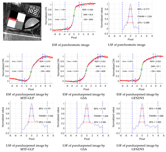 Moreover, the spatial quality of images pansharpened using an ESF and LSF is further analyzed. Figure 10 and Figure 11 show the ESF and LSF along and across the panchromatic image in the blue band according to each algorithm in the Salon and Baotou regions, respectively. As shown in Figure 10 and Figure 11, the ESF curves of the pansharpened image generated by the GFNDVI present a pattern similar to that of the original panchromatic image compared with those of the pansharpened images generated by the GSA and MTF-GLP. Additionally, the LSF curves of the pansharpened images obtained by the GSA and MTF-GLP have a relatively wide full width at half maximum (FWHM), and the distortion of the LSF curve is large compared to that of the original panchromatic image. These results confirm that the linearity of the edge target generated through the proposed algorithm is associated with a small error and high SNR and MTF values. This trend was common at both experimental sites, as shown in Figure 10 and Figure 11. Therefore, the proposed GFNDVI algorithm effectively preserves the spatial clarity of original panchromatic images in the pansharpening process. Notably, the proposed method yields similar and ideal ESF and LSF curve shapes compared with the existing techniques. Furthermore, the proposed technique retrieves high SNR and MTF-Nyquist values.