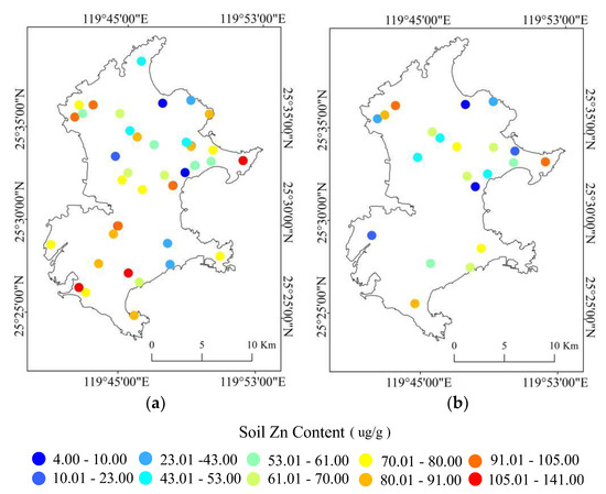 Spatial distribution of the 67 soil samples and their Zn contents. The colors denote the different ranges of soil Zn content, (a) the 46 modeling samples and (b) the 21 verification samples.